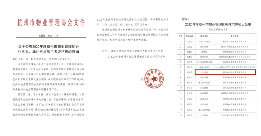 与此同时,本周,杭州市物业管理协会正式公布《2022年度杭州市物业管理优秀住宅小区名单》。德信服务在管大江源著项目,凭借和谐有爱的业主关系,美丽整洁的小区环境,积极向上的小区氛围,成功获评“杭州市物业管理优秀住宅小区”。